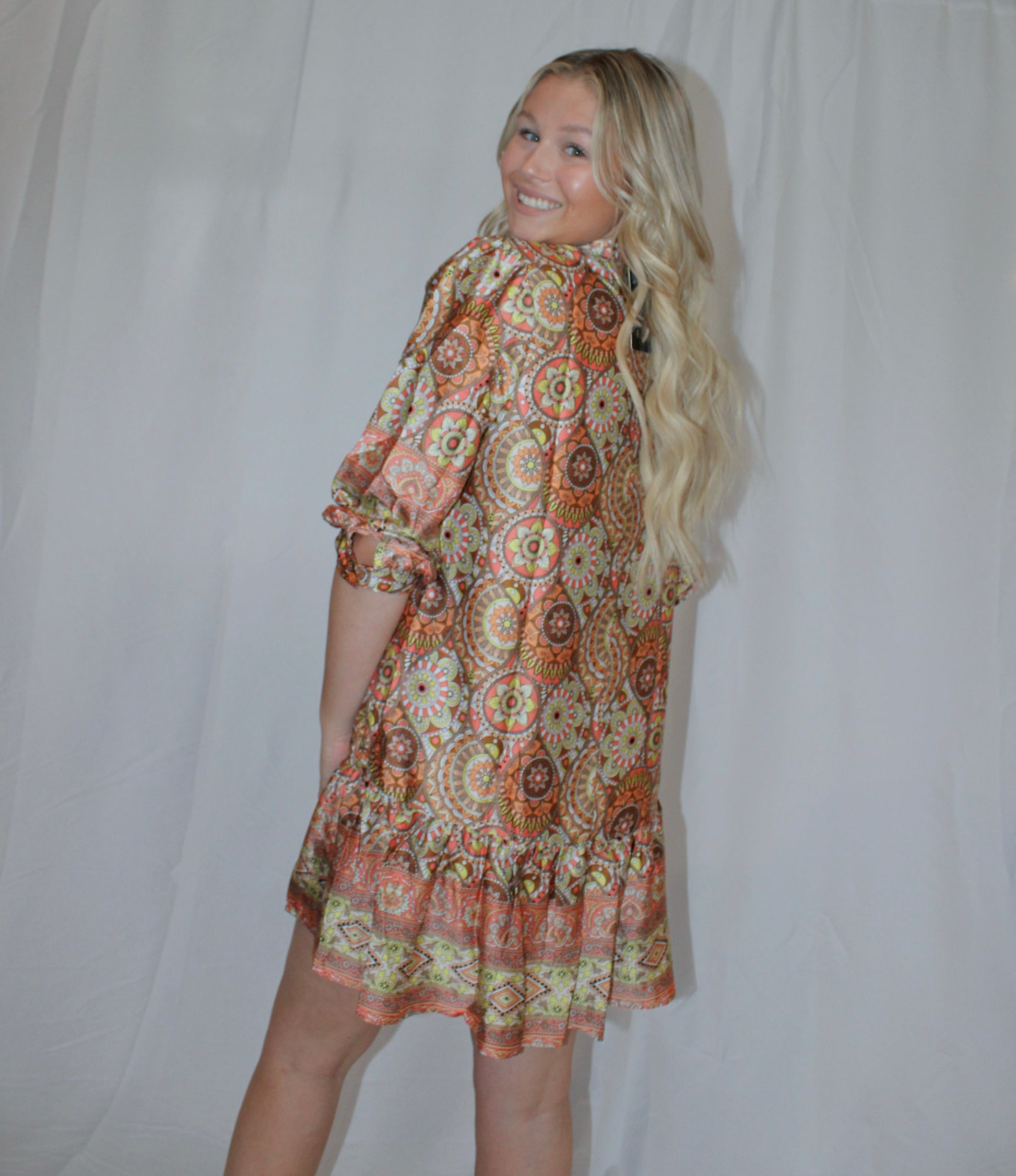 Brown Aztec, printed collard tie neck dress. Looks stylish and stay comfortable with this brown Aztec printed tie neck dress. Perfect for a variety of occasions, it’s sure to become a go to your wardrobe.