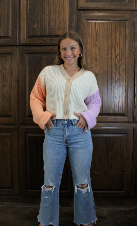 This color block sweater is so precious! It has funcional buttons so you can wear it by itself or wear it over a cute tee.
